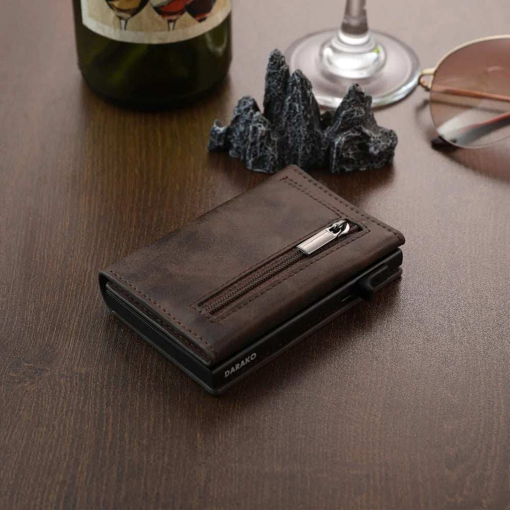 El VANTREX™ está diseñado con un perfil ultradelgado, similar al tamaño de una tarjeta, que se desliza sin esfuerzo en cualquier bolsillo sin crear volumen incómodo. Su estructura ligera de aluminio reforzado combinada con un acabado elegante en cuero premium ofrece una sensación moderna y sofisticada al tacto.